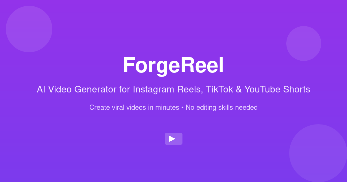 ForgeReel is an AI video generation platform that lets you create short, viral videos for Instagram, TikTok, and YouTube in minutes without editing skills. Simply describe your idea, and our AI video generator handles the rest.